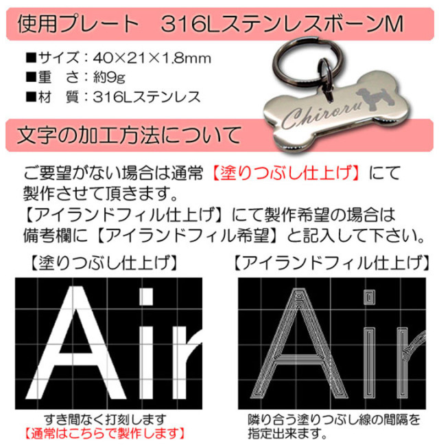 | 刻印について | ・フォント選択【1番・2番・3番・4番・5番・6番・7番・8番・9番・10番】 ・付属品選択【I:ステンレスWリング(S)・J:ステンレスWリング(M)】 ・刻印文字 表面(ペットの名前)【 】 例:チロル 裏面(メッセージなど)1行目【 】 例:迷子です! 裏面(ご連絡先など)2行目【 】 例:050-3568-9517 裏面(オーナー名など)3行目【 】 例:白木 ・シルエットの種類【 】 ※シルエット無しの場合は未記入でOK。 |