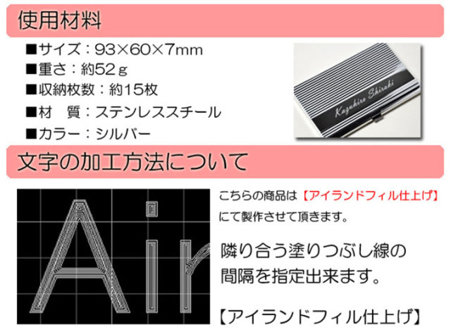 | 刻印について | ・フォント選択【1番・2番・3番・4番・5番・6番・7番・8番・9番・10番】 ・刻印文字 1行目【 】 例:AirSkyWeb 2行目【 】 例:Kazuhiro Shiraki ・備考【 】 ※標準の入力欄は20文字以内となっておりますが、 20文字以上刻印希望の場合は、決済画面にある備考欄に刻印内容をご記入下さい。 |