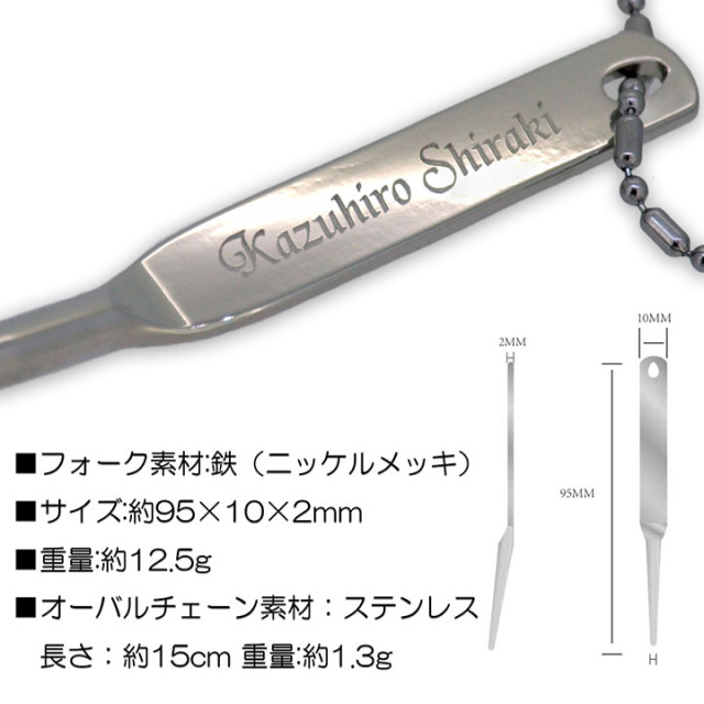 | 商品説明 | ■名称:グリーンフォーク ■フォークサイズ:約95×10×2mm ■フォーク材質:鉄(ニッケルメッキ加工品) ■オーバルチェーンサイズ:約15cm ■オーバルチェーン材質:ステンレス ■カラー:シルバー |